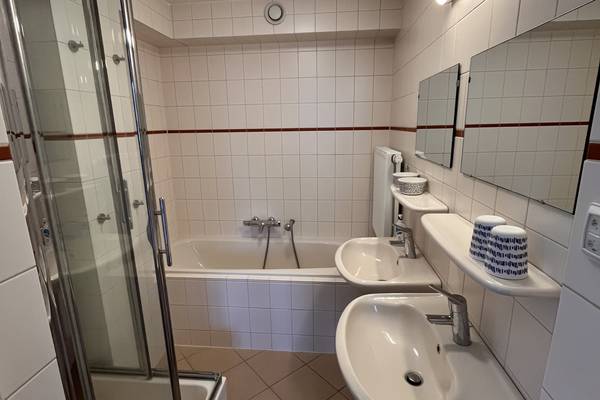 - Twee badkamers; op de begane grond met douche en wastafel. Op de eerste etage met douche, wastafel én een royaal ligbad. Twee separate toiletten.